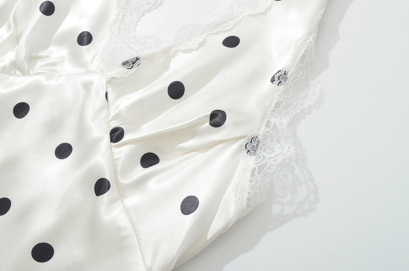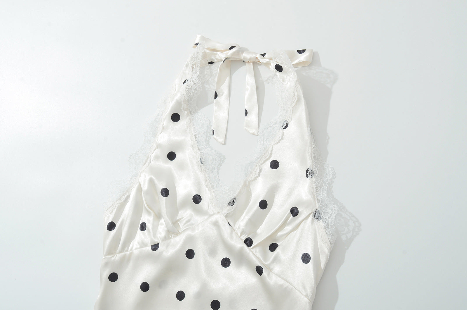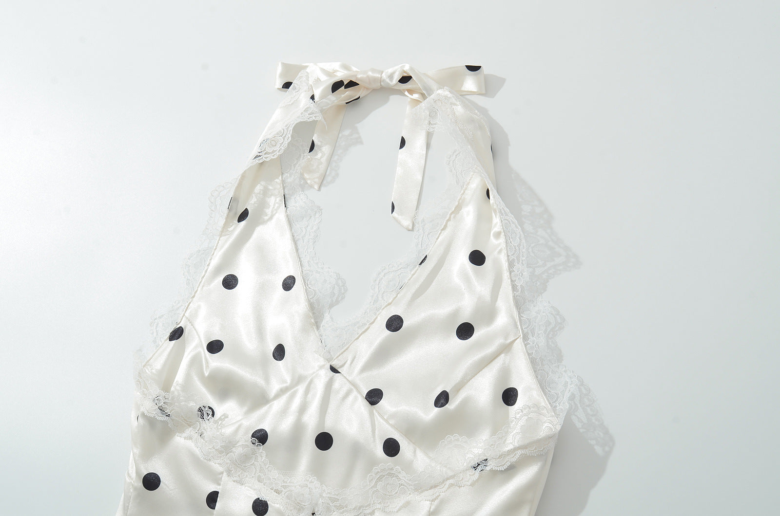 The Sophia Polka Dot Slip Dress blends charm and allure in one timeless silhouette. Crafted from silky satin with a flattering halter neckline, delicate lace trim, and a classic polka dot print, it captures the perfect balance between vintage femininity and modern elegance.